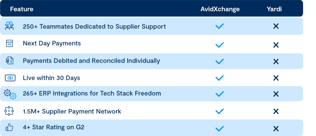 Yardi gives you software to configure. AvidXchange gives you a team of 250 dedicated specialists that manage supplier onboarding, payment enrollment, exception handling, and more — so your AP team can focus on strategic work, not onboarding or troubleshooting.